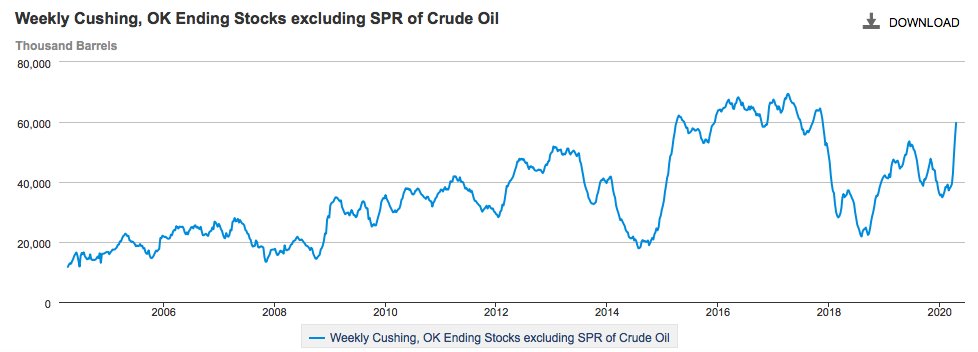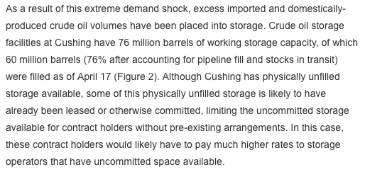 Today’s EIA report is interesting. Cushing weekly ending stocks were high, but still 10 million bbl below their all-time high. But the report suggests there is a lot of pre-committed storage space, presumably because production isn’t slowing down fast enough.