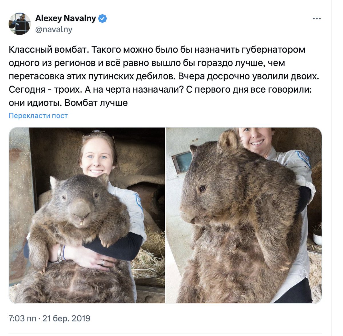 Back in 2019 he suggested that a wombat would be a better governor for a Russian region than "Putin's morons".