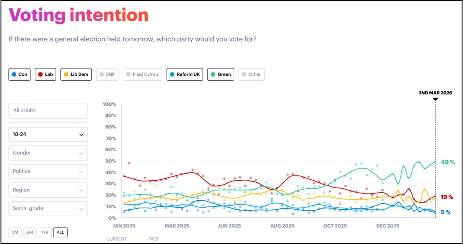 2/ Nearly half of 18-24s now support the Greens, a doubling in 6 months