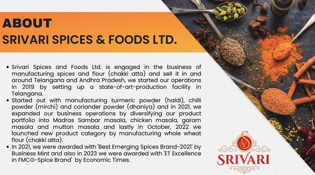 Incorporated in 2019, Srivari Spices and Foods Ltd manufactures spices and flour (chakki atta). The company also undertakes the process of marketing and selling its products. The company operates its operations primarily in and around Telangana and Andhra Pradesh.