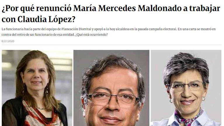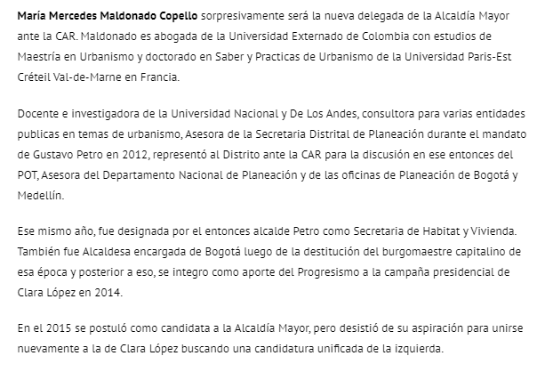 María Mercedes Maldonado, según los medios iba a ser delegada de la alcaldía de Claudia López ante la CAR, luego pasó a planeación distrital y posteriormente renunció. Coordinadora programática de la campaña Petro 2018-2022