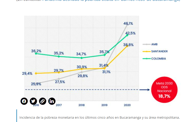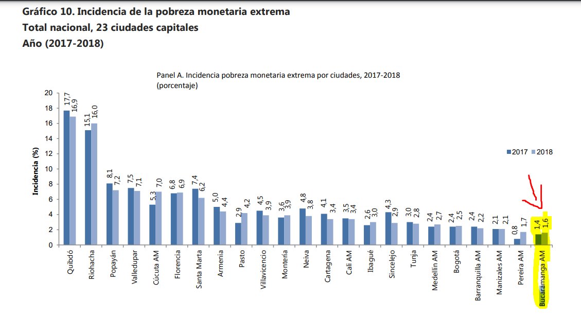 2. Según la Cámara de Comercio de Bucaramanga citando al DANE hubo aumento significativo de la pobreza monetaria extrema pasando del 1,1% en 2016 a 1,4% en 2017. Mirando las cifras del DANE, en 2018 fue de 1,6% camaradirecta.com/temas/document…