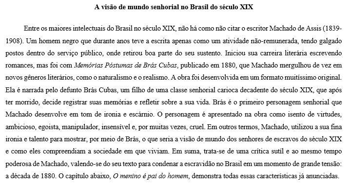 1) Contextualizo o autor/fonte: a obra de Machado pode ser utilizada das mais diversas formas, pois ela é rica e um mundo complexo em si. Mas, neste caso, trata-se de uma atividade sobre a escravidão e a visão de mundo senhorial no século XIX. Eis a introdução do texto/atividade