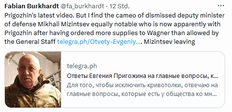 defections (i.e. to an *alternative* power base) from state bodies to Prigozhin could turn out to become dangerous as personalist rulers must not tolerate any alternative, be it liberal opposition or warlords. Many observers paid attention to "grandfather" and "d***head" in