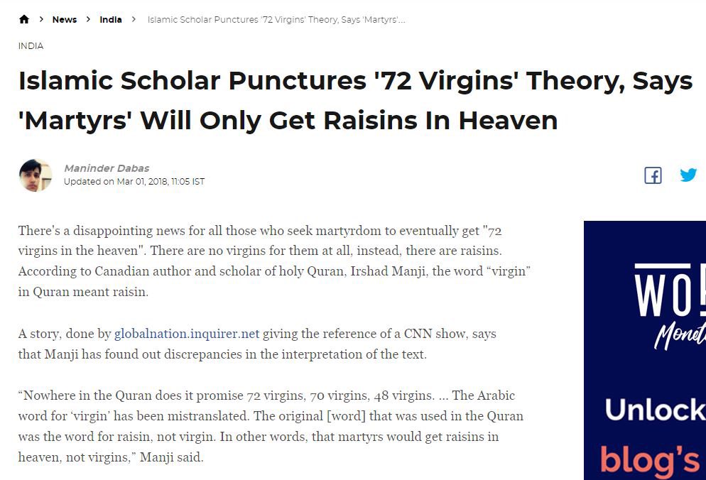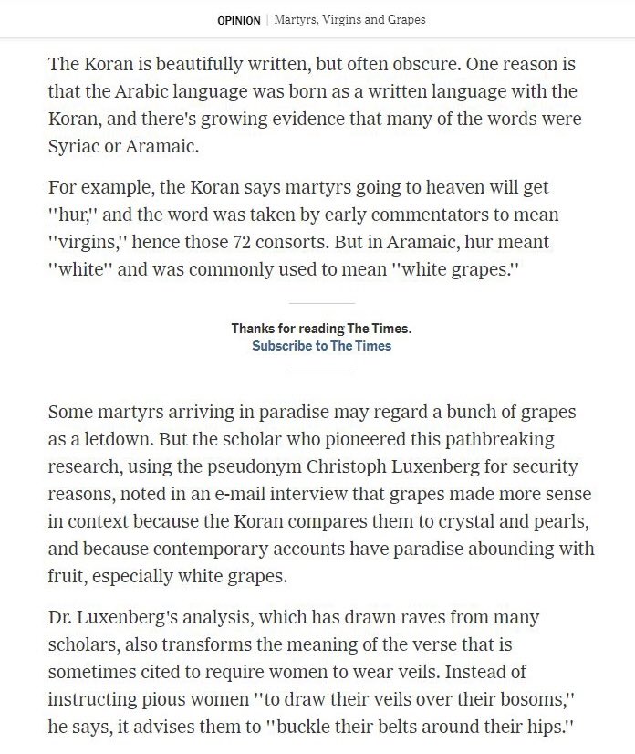 For quite some time, commentators like Nicholas D. Kristof (@NickKristof), Irshad Manji (@IrshadManji), etc. have claimed that the Qur’ānic word “ḥūr” [حُور] refers to “grapes” or “raisins” and not actual female beings. Other devotees, like @ImtiazMadmood, just follow them.