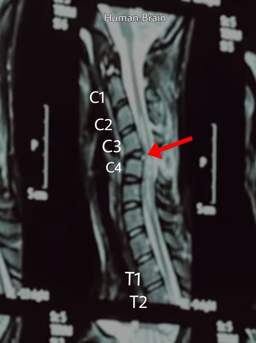 Dia mengalami cedera pada cervical region (tulang leher), C3-C4.