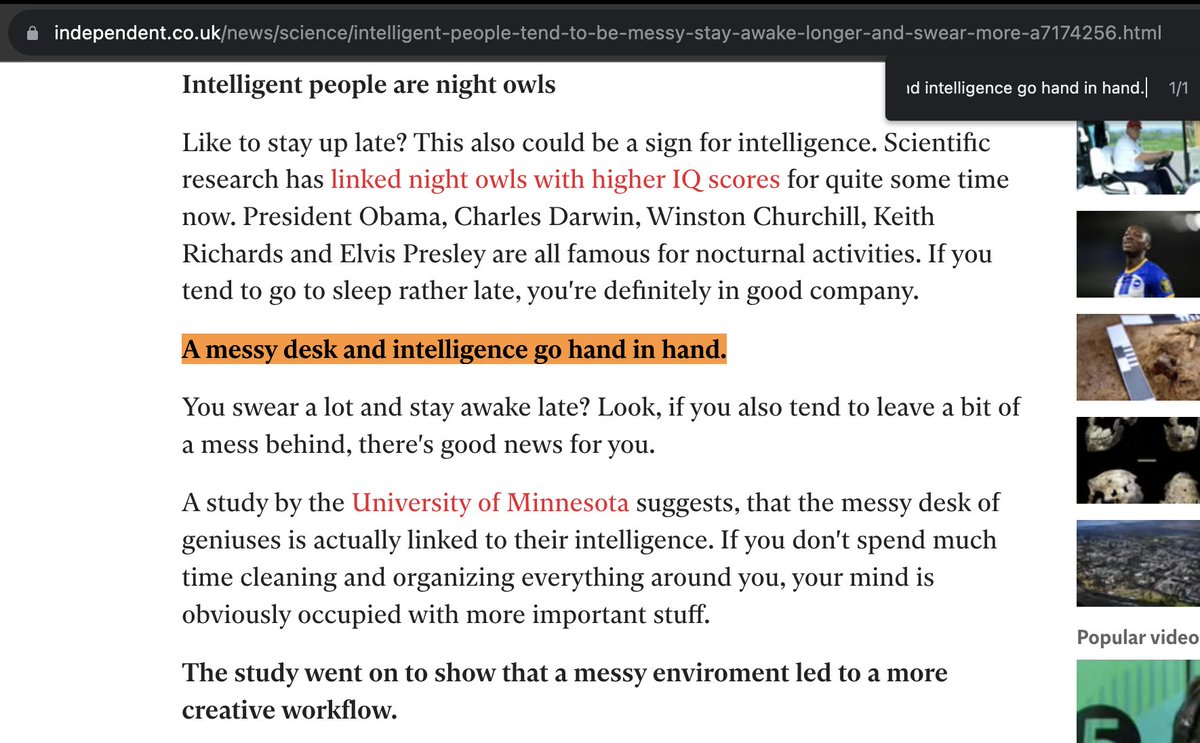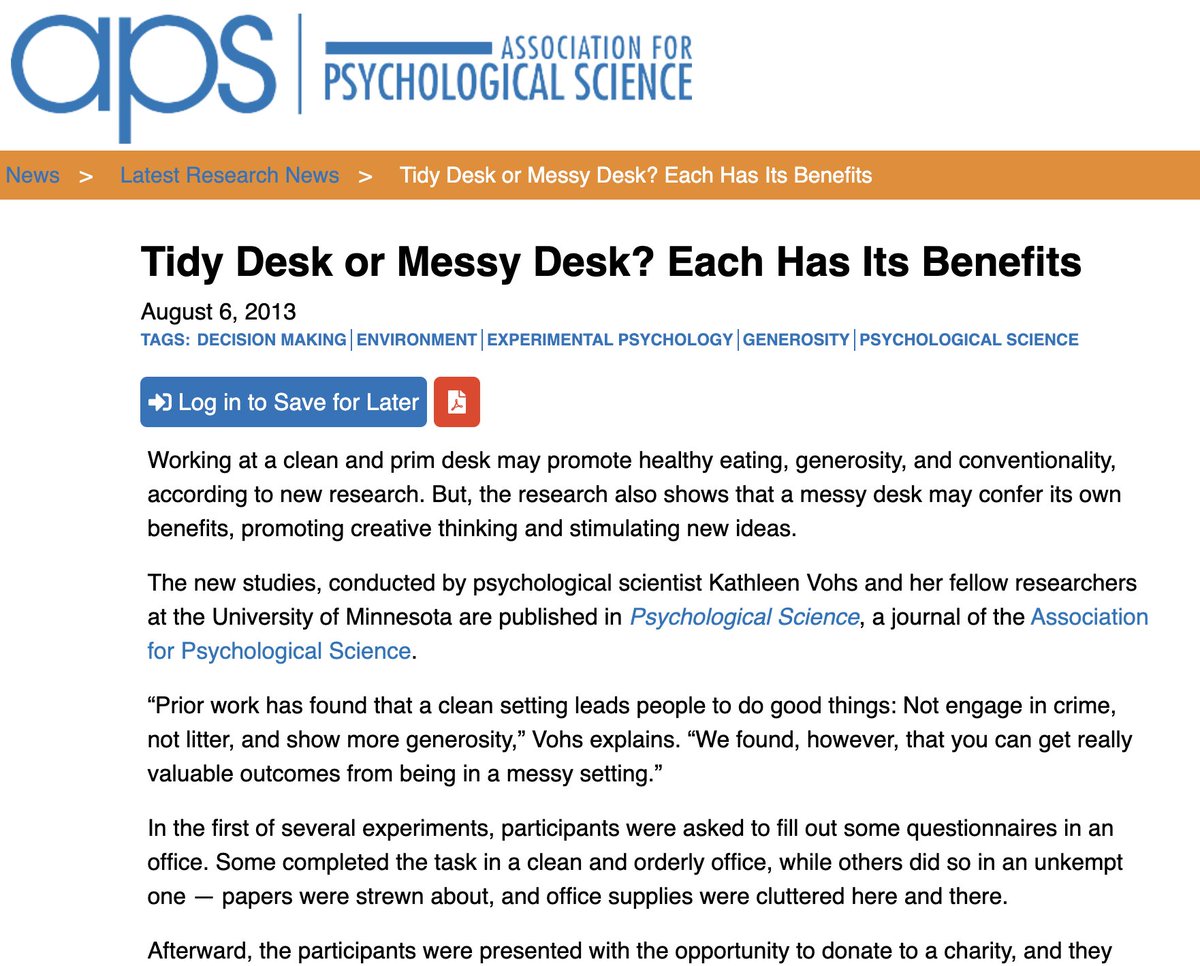 حالا از کجای این دراومده که باهوشها میز کار و اتاق هاشون شلختهتره؟ یه آقایی به اسم John Stanley Hunter که روزنامهنگار حوزهی اقتصاد و سیاسته اون مقالهی Independent رو نوشته و همینطوری یه ادعای گنده و بدون پشتوانهای بر حسب اون مقاله درآورده. و یک آقای دیگهای که روانشناسه در توییتر فارسی اون ادعا رو آب و تابی هم داده و اینطوریه که مقاله بعد از ۴ لایه فاصله گرفتن از اصلش به شکلی کاملاً غلط و گمراهکننده بهدست شما رسیده.independent.co.uk/news/science/i… psychologicalscience.org/news/releases/… journals.sagepub.com/doi/abs/10.117…