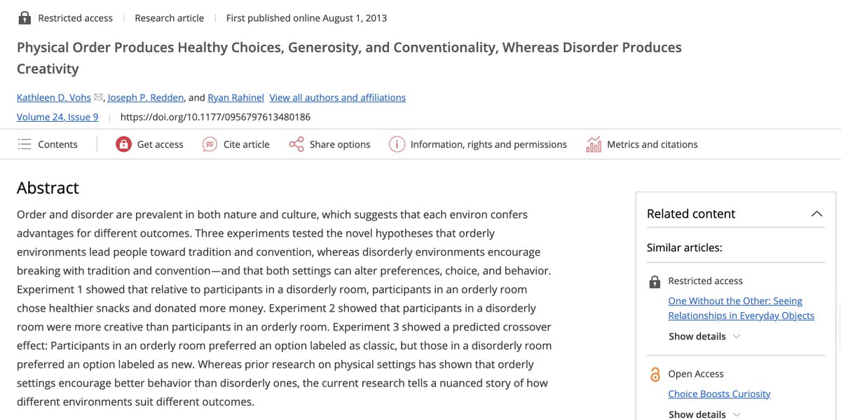 مقاله اصلی حالا چی میگه؟ میگه ما رفتیم یکسری آدم رو نشوندیم در یک اتاق با میز مرتب، و یکسری دیگه رو نشوندیم در اتاقی با میز نامرتب. بهشون گفتیم یکسری پرسشنامه الکی رو پر کنند (صرفاً واسه این که یه مدت تو اون اتاقه کاری کرده باشن). بعدش بهشون این فرصت رو دادیم که به خیریه کمک کنند یا بین خوردن سیب یا اسنک انتخاب کنند. نتایج نشون میده اونایی که توی اتاق مرتب کار کرده بودند در مقایسه با گروه میزنامرتب، پول بیشتری به خیریه کمک کردند و بیشترسیب رو به جای اسنک انتخاب کردند!!