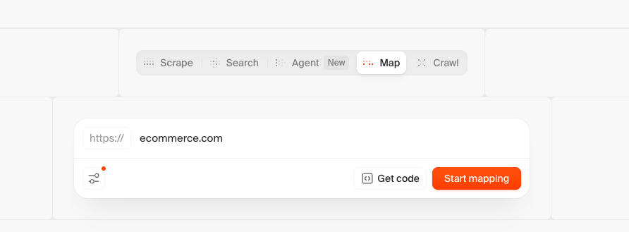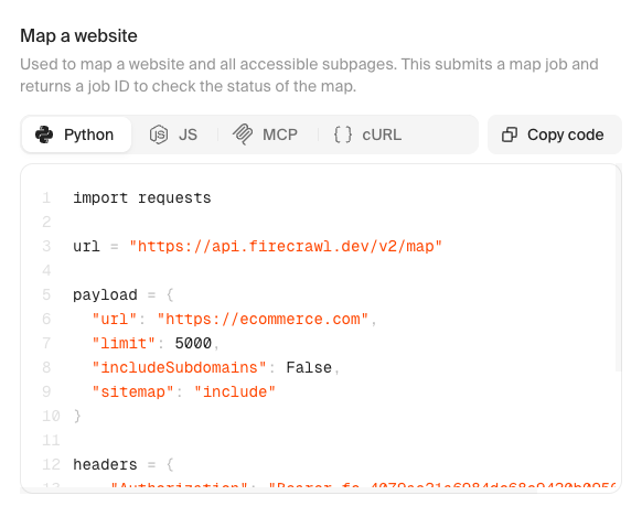 Vas a y te registras. Dentro del playground vas a map y pones la url del ecommerce que queres scrappear. Le vas a dar click a get code que te va a dar algo asi como la segunda foto. Te guardas los dos cachos de codigo que te da, uno es la consulta y el otro el formato de la respuesta.firecrawl.link/twitter