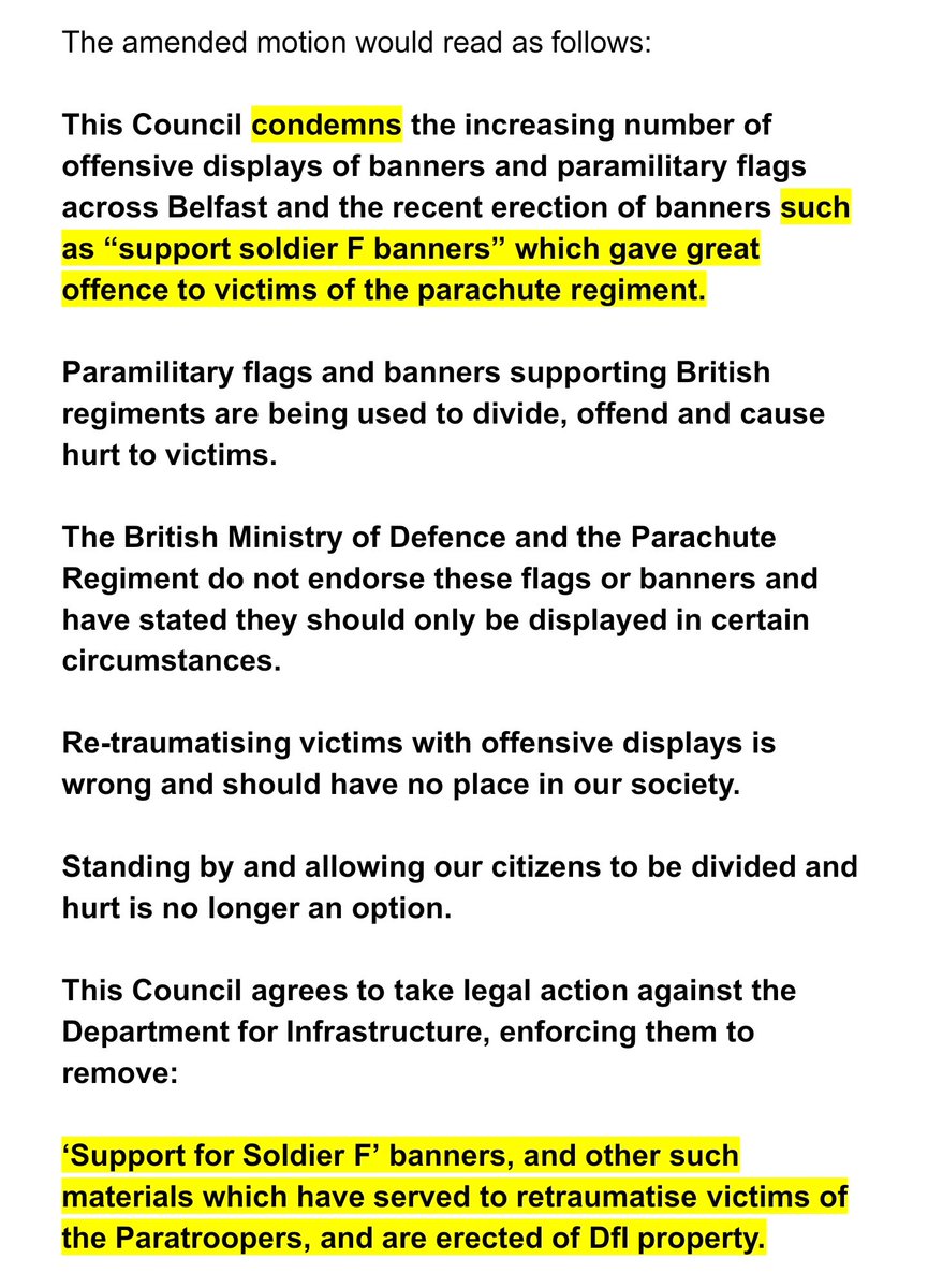 Ridiculous that this has to be done, but @sinnfeinireland councillors are blatantly lying about a council vote which took place earlier today. The initial motion was brought by Sinn Féin called for the removal of all flags and banners by DfI, if they didn't have permission to fly