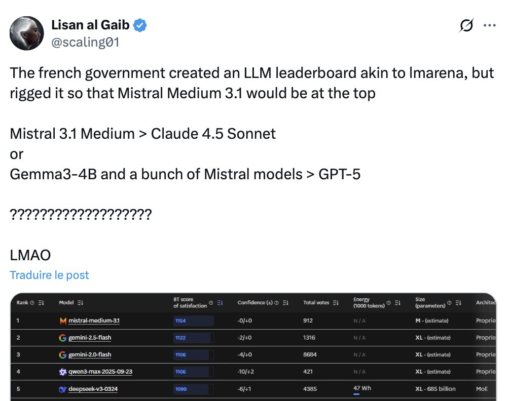 https://twitter.com/LelloucheNico/status/1985743498599915986Le classement repose sur le comparateur en ligne du ministère de la culture , qui demande aux utilisateurs de juger « à l’aveugle » les réponses des modèles à leurs questions.comparia.beta.gouv.fr