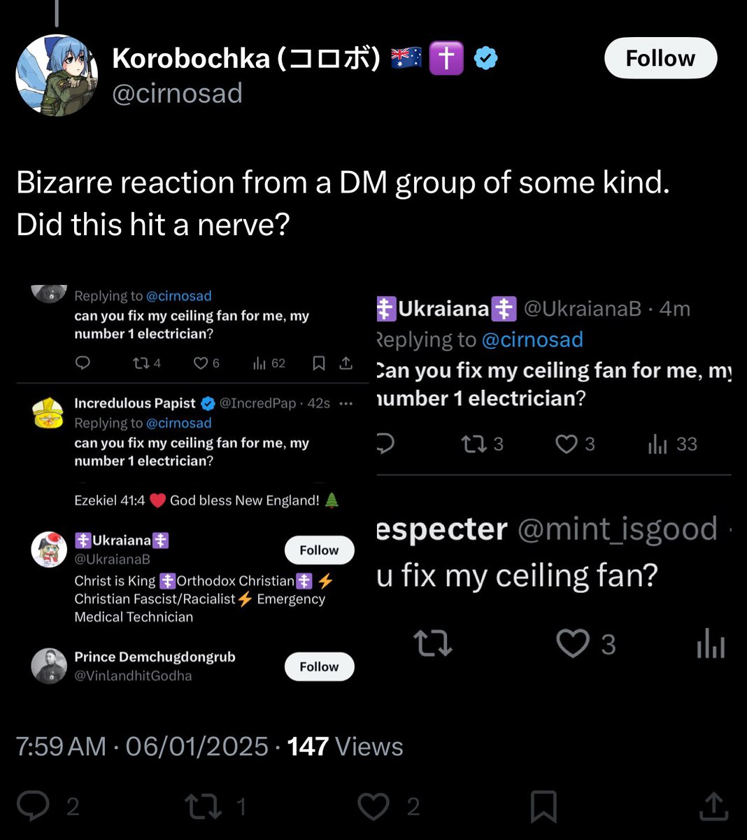 They appeared some time ago. Replies to Cirno either containing nothing but ceiling fans gifs or a phrase along the lines of "please come install my ceiling fan".