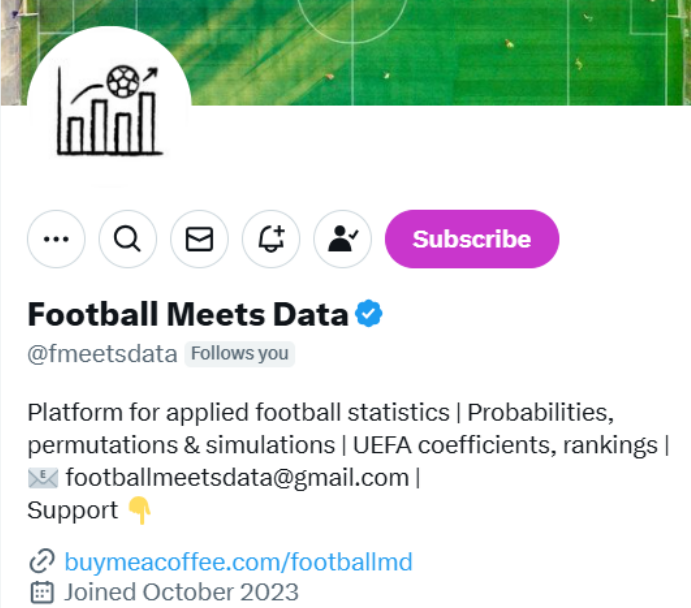 Platform for applied football statistics | Probabilities, permutations & simulations | UEFA coefficients, rankings | ๐ง footballmeetsdata@gmail.com |