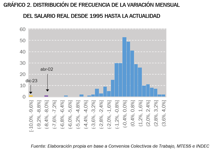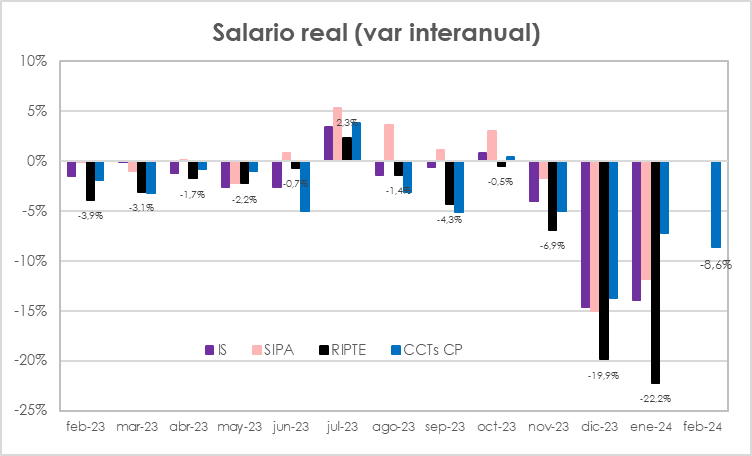 Primero, los sal reales en dic 23 marcaron una caída mensual sin precedentes en los últimos 30 años: -10% en un solo mes. superando la máxima caída mensual de la historia reciente establecida por el 8,3% de baja que se registró en abril de 2002 en el contexto de la devaluación y