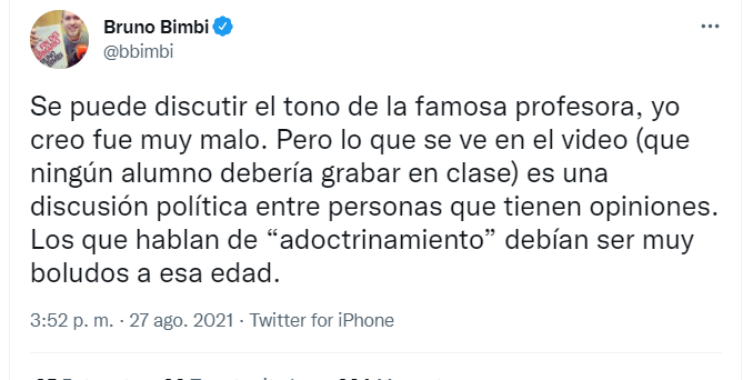 Bimbi y gran parte de la progreburguesia argentina creen que no hubo adoctrinamiento porque lo que expone la profesora es apenas una versión fuera de tono de la religión que profesan. Sus ideas son las buenas, las de todos y por lo tanto, no hace falta adoctrinar sobre ellas.