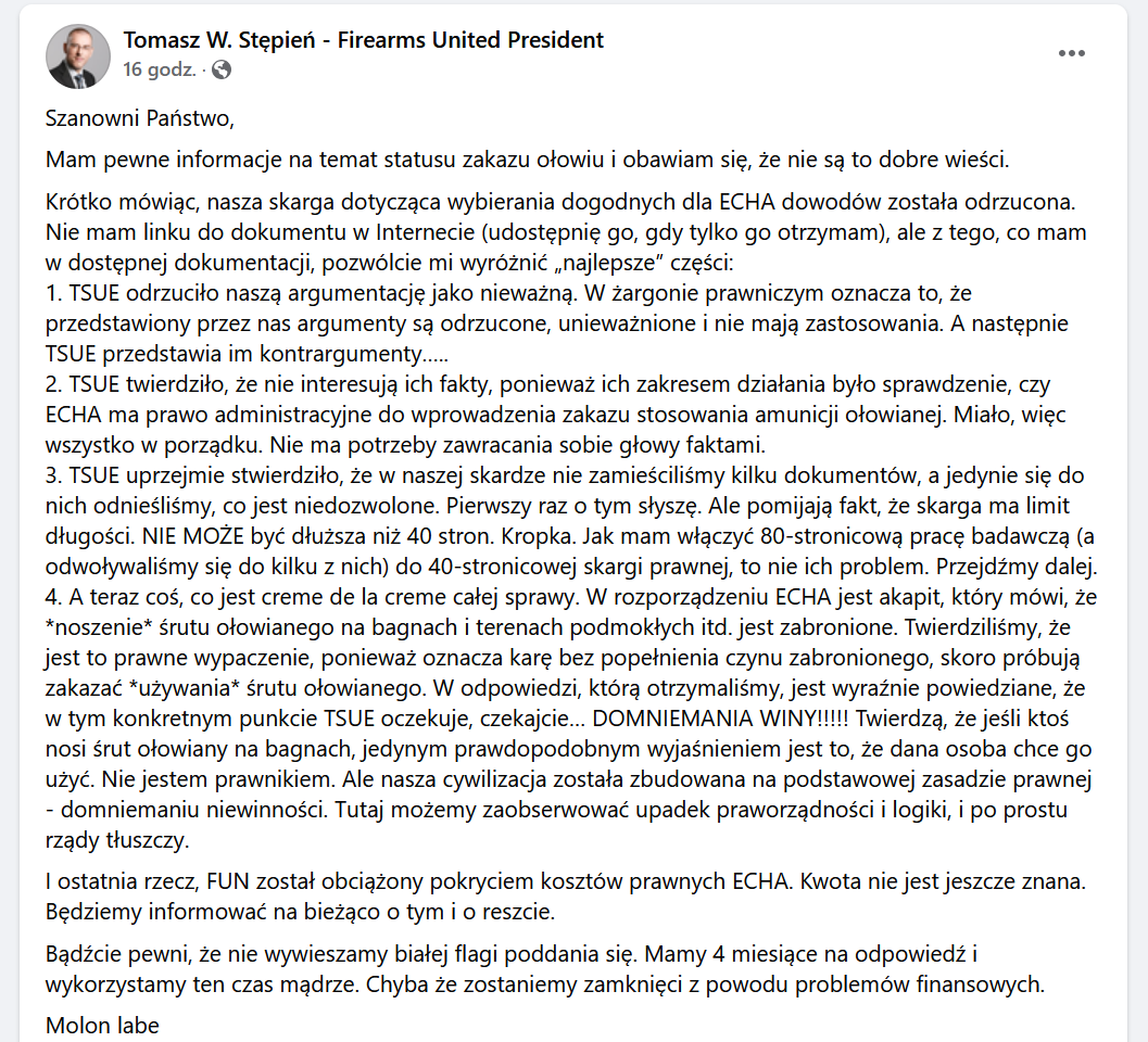 Jak widzicie z relacji Tomka sprawy idą w bardzo złym kierunku – ze stanowiska ECHA wynika, że KAŻDE przemieszczanie amunicji z ołowiem będzie podstawą do ukarania. Nawet jej transport ze sklepu do domu przez teren objęty zakazem UŻYWANIA (pod warunkiem, że będziecie (...) 2/n