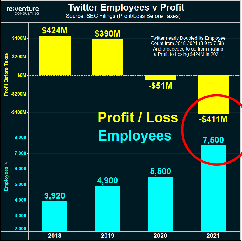 Reflexión: Con 7.500 trabajadores en nómina, 5000 autónomos (luego entraremos en esto) y dependencia absoluta de la publicidad para ser viable, el modelo de negocio de Twitter no era esencialmente distinto del de una gran grupo de prensa tradicional.