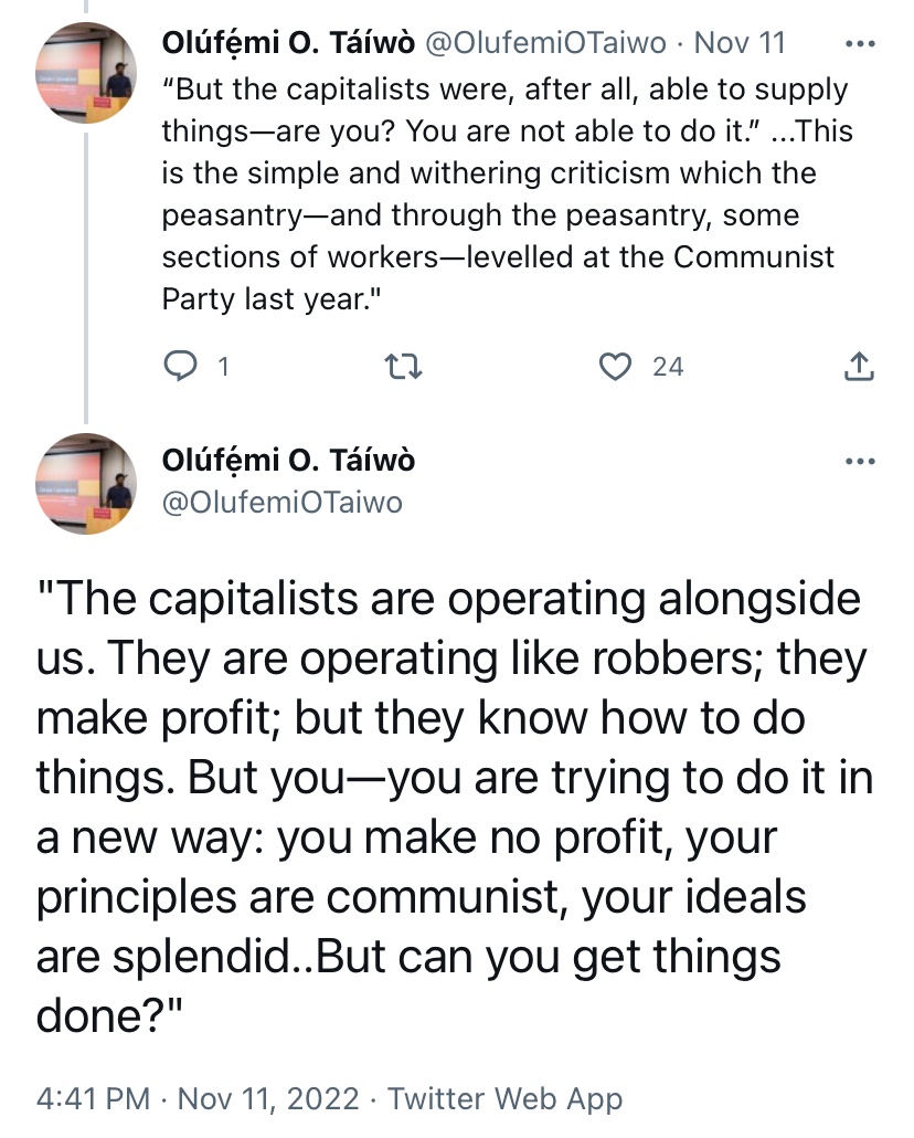 @OlufemiOTaiwo Where does the institutional capacity to organize, manage, and produce in extraordinarily complicated systems like electric power actually come from? Who will be today's New Deal technocrats who confront the thorny details of, say, public power, in oppo to the capitalists?