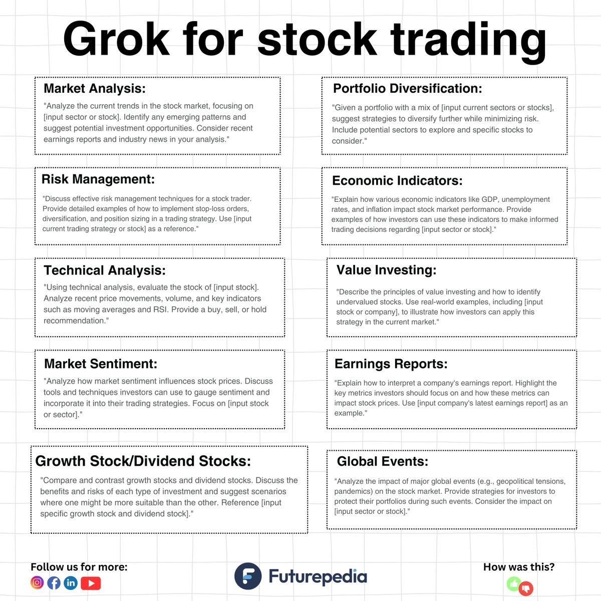 Here are 10 Grok 3 powerful prompts I use for stock trading and investing: 1/ Market Analysis: