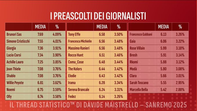 Partiamo dalla classifica combinata delle prime due serate, in cui - come sappiamo - ha votato soltanto la Sala Stampa (+ TV, Radio e Web).