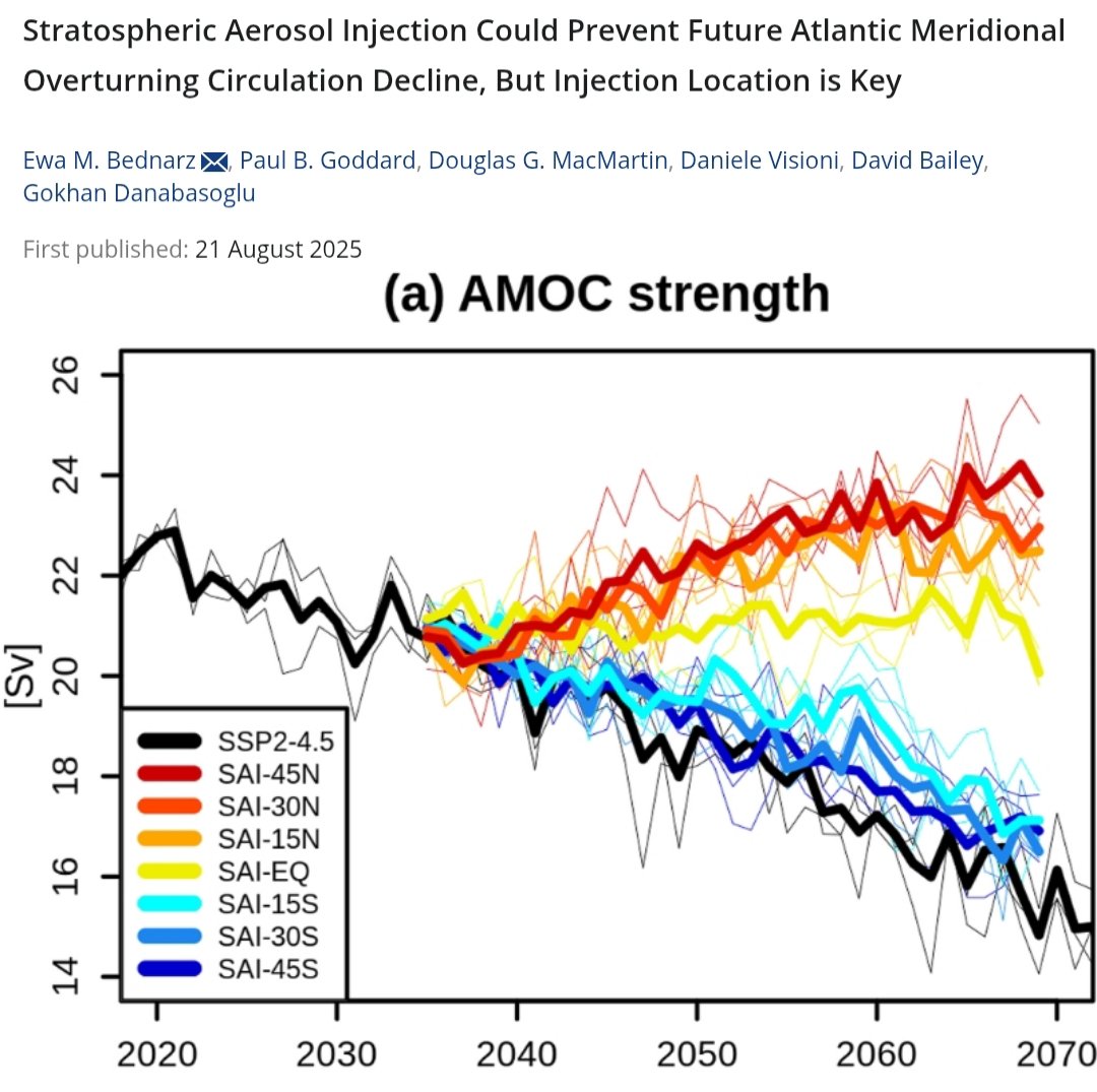 A NEW study suggests Stratospheric Aerosol Injection (#SAI) could help prevent the decline of the Atlantic Meridional Overturning Circulation (#AMOC), but only if aerosols are injected in the appropriate latitude & hemisphere.