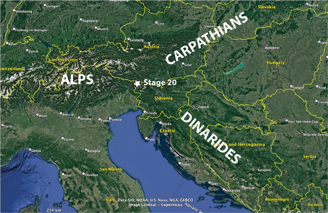 The Alps are piled-up rock packages of a few km thick that were offscraped from the European plate that subducted below Adria. The riders will cross remnants of two oceanic basins (the blue colors) and a small continent (the 'Brianconnais', in orange).