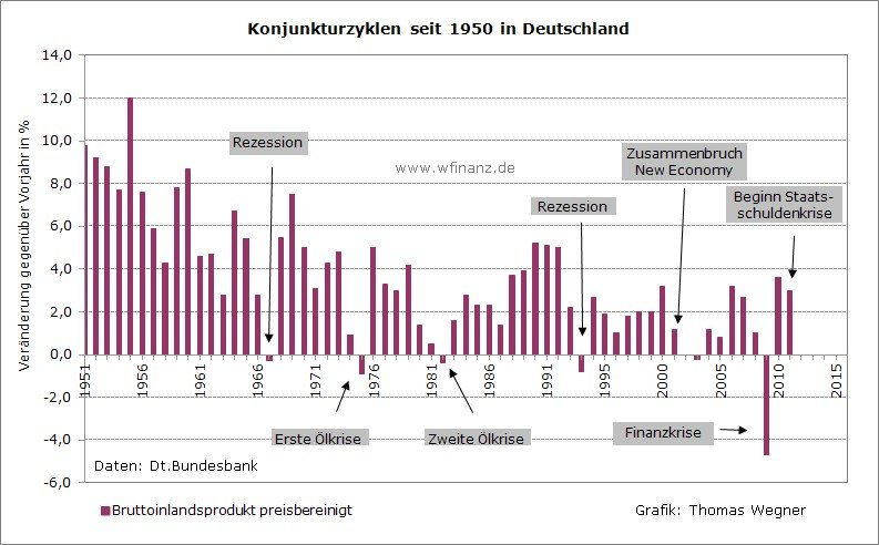 über den gesamten Zeitraum hinweg abfällt, von anfänglich bis zu 10% pro Jahr bis nur noch knapp über Null, als gegenwärtig zu erwarten in diesem Jahr. Diesem längerfristigen Abwärtstrend sind periodische Konjunkturschwankungen überlagert, die in den Jahren 1967 („Rezession“), 🧵