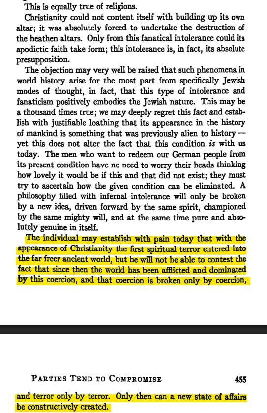 In his autobiography, Hitler claims that the appearance of Christianity was "the first spiritual terror" that entered a "far freer" pagan ancient world (Mein Kampf, Manheim, Houghton Mifflin, Boston 1943, pp. 454-455).