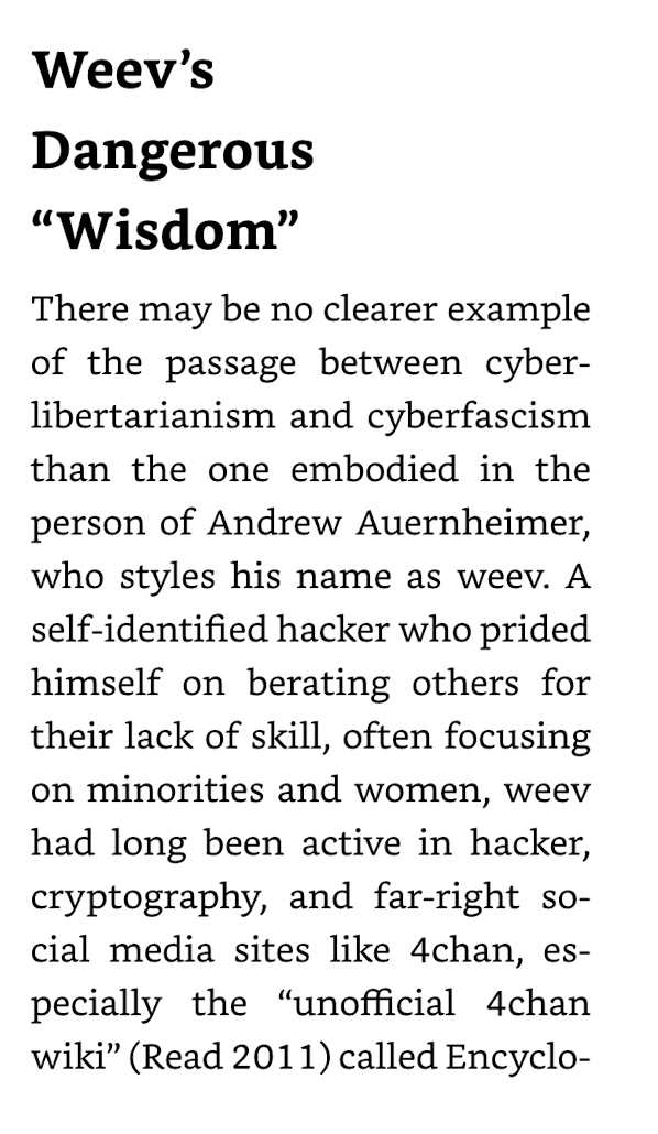 The late David Golumbia saw weev (real name: Andrew Auernheimer) as a linchpin in Silicon Valley's turn toward fascism. He spends nearly a whole chapter on weev in "Cyberlibertarianism: The Right Wing Politics of Digital Technology."