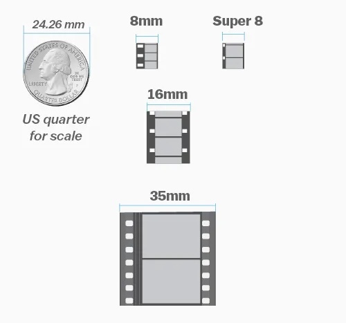 Cuando hablamos de películas en 8, 16, 35 o 65 mm nos estamos refiriendo siempre al ancho de la película de celuloide sobre la que se captura cada fotograma. Aquí lo veis: