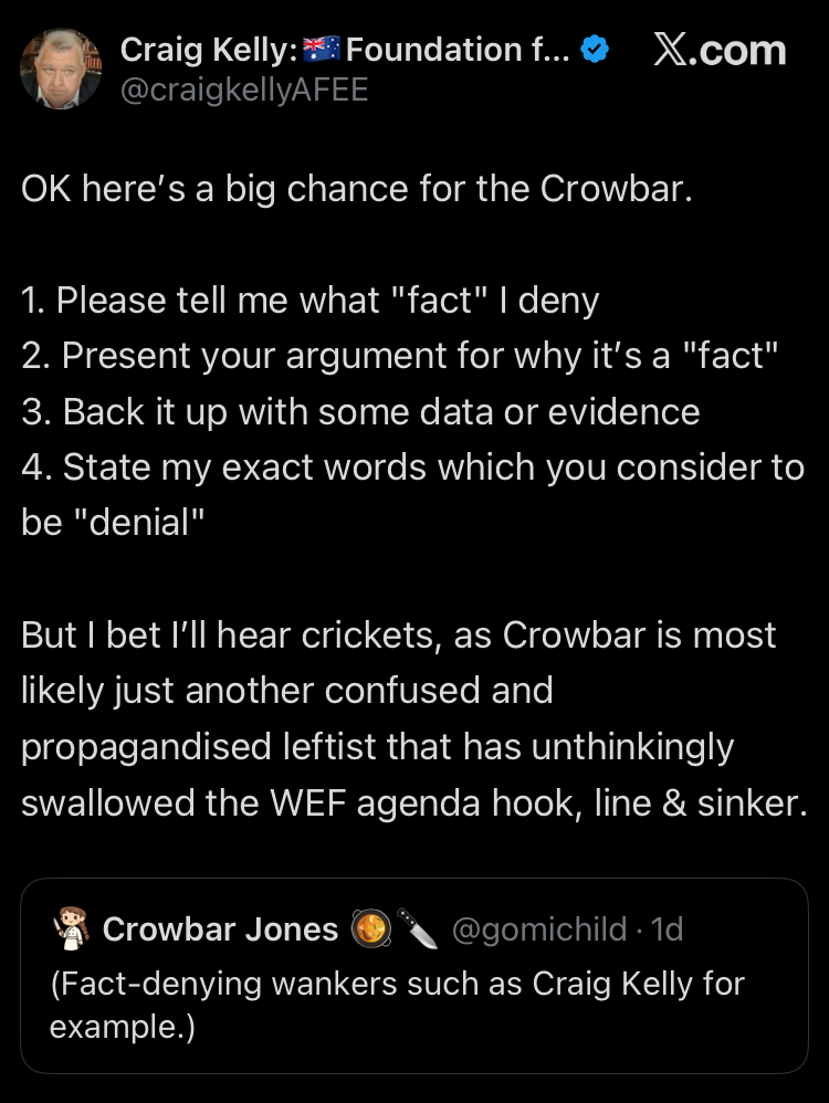 calling me out here to further illustrate the validity of my assertion of â(Fact-denying wankers such as Craig Kelly for example.)â