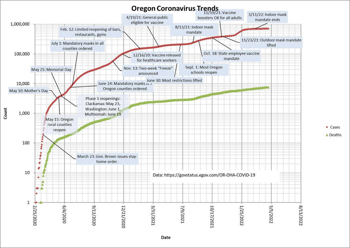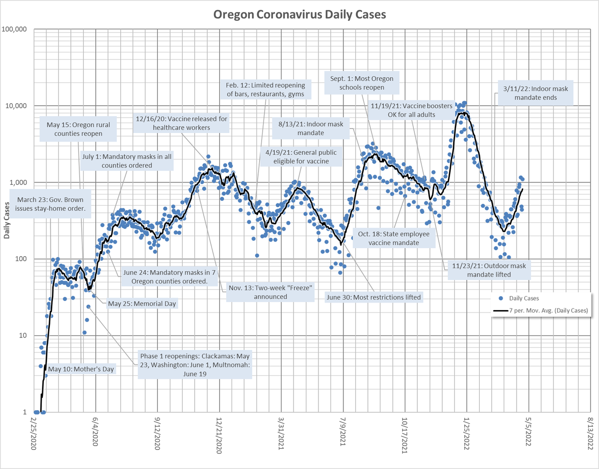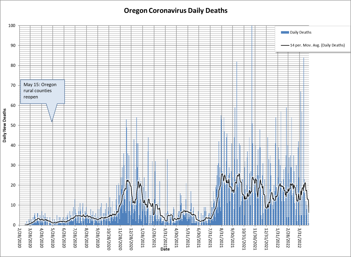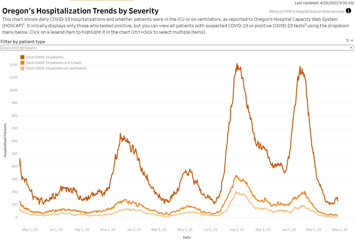 a short-lived break. Hospitalizations are still bouncing around at low levels though, which is a hopeful sign. There are 159 total patients, 17 in ICU, & 5 ventilator patients. Where @OHAOregon is falling down is in vaccination of seniors in care facilities. They've dropped...