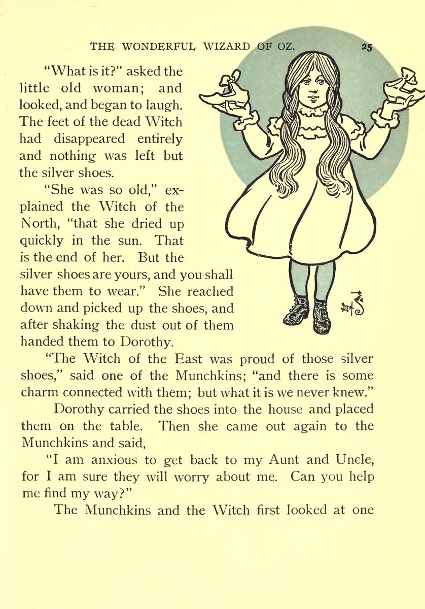 There are actually multiple reasons. The first is the most obvious: in the original book by L Frank Baum, Dorothy’s slippers are silver, with the illustrations by W.W. Denslow depicting them with a pointed toe and mary jane-style buckle.