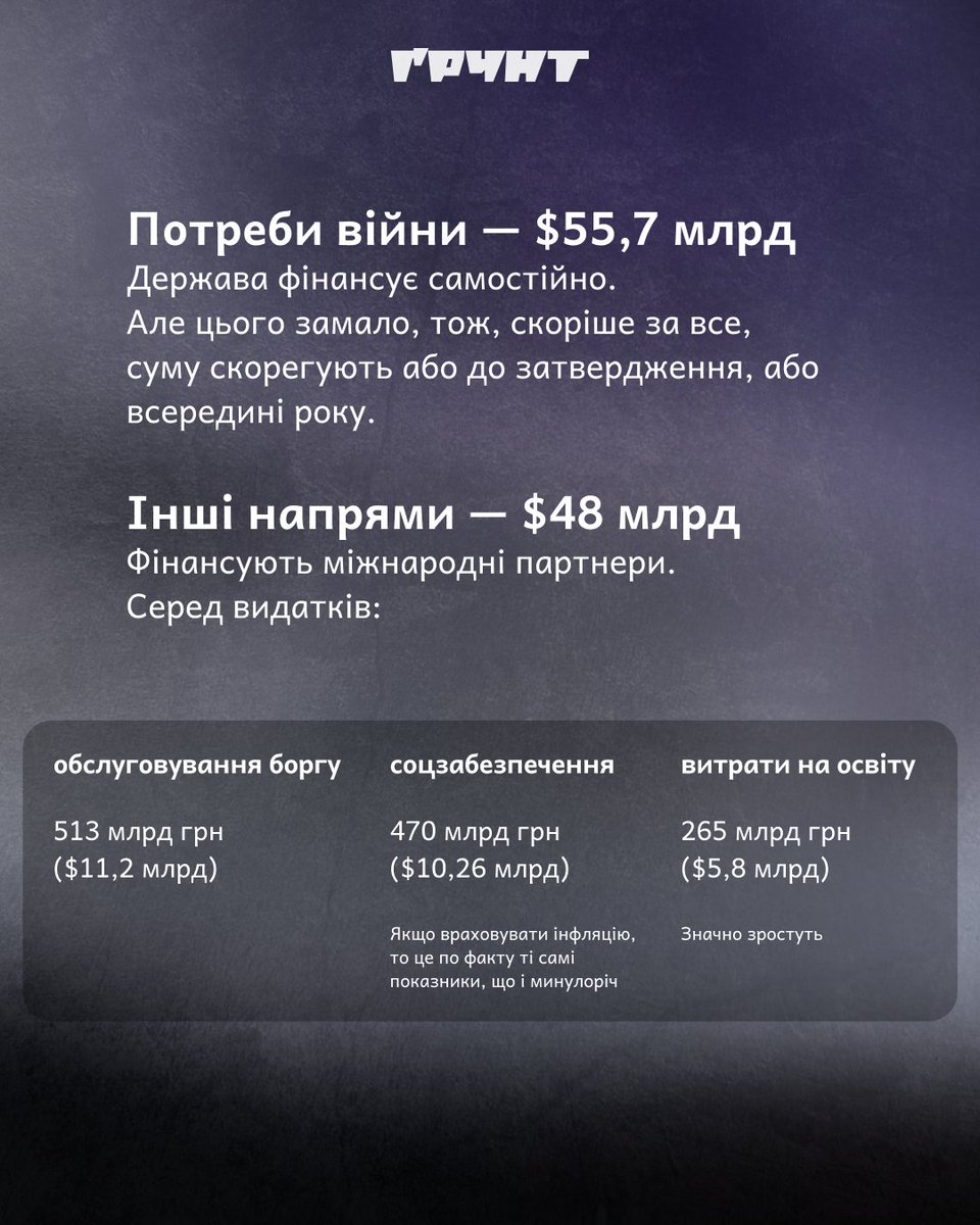 За даними Центру економічної стратегії, усі витрати (разом з вищезгаданими) на 2026 рік – це близько 4,8 трлн грн або $104 млрд.