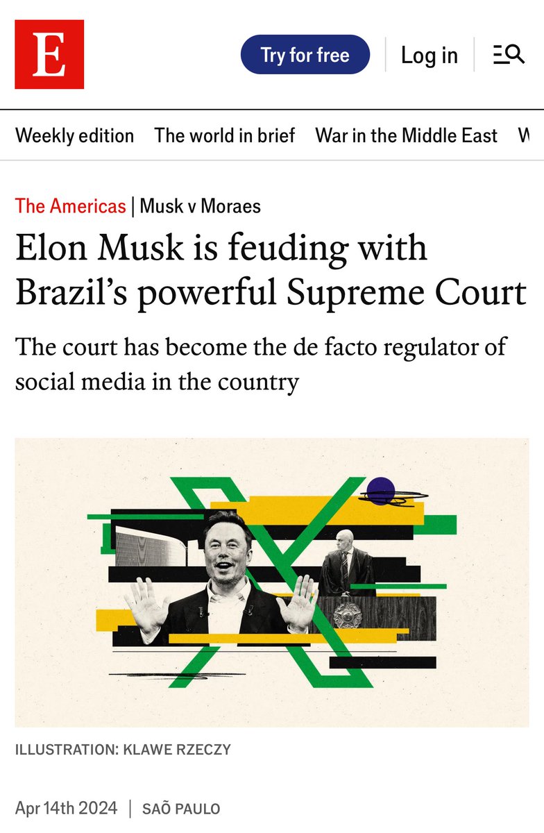 Isso começou em ABRIL DE 2024, quando a The Economist publicou “Elon Musk is feuding with Brazil’s powerful Supreme Court”
