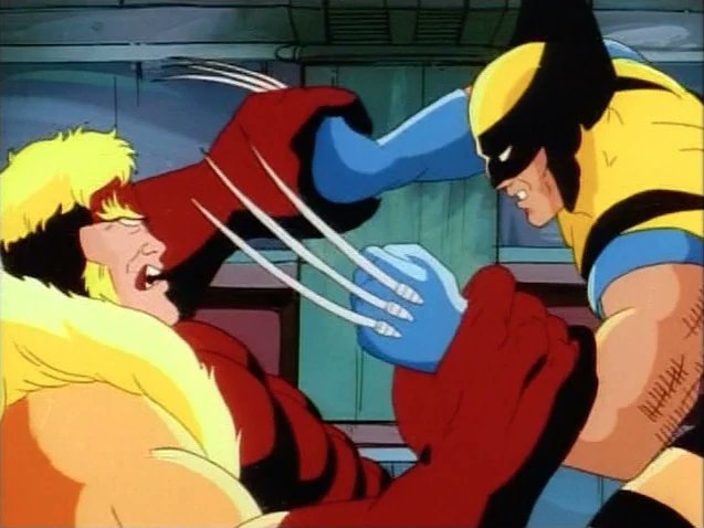 Wolverine ameaçar um inimigo com suas garras mas os roteiristas não deixarem ele fazer nada porque é um desenho de classificação livre