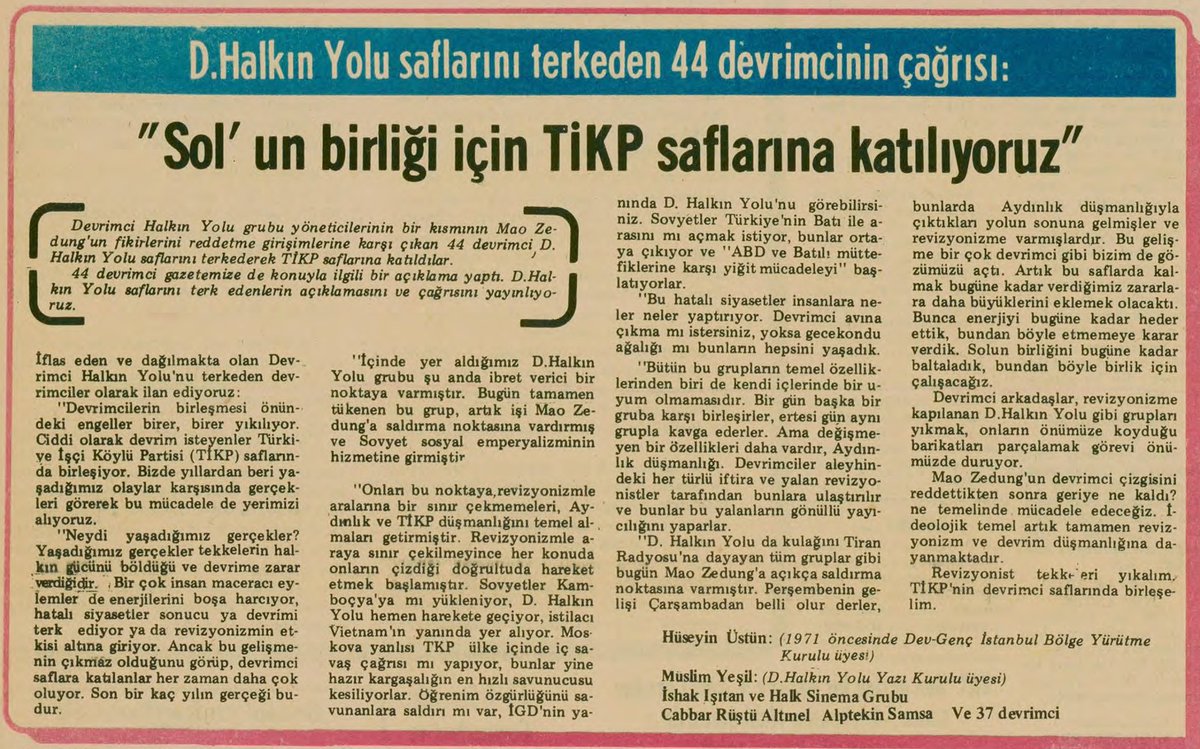@GonzaloUpholder@VerdeEsRojo First of all there is no existing United Front in Turkey. Secondly, you can take those informations from İK's works (like General Critic), but for the answer: TKP (M-L) (this was it first name) split from TİİKP, i.e. Shafak revisionists in April 24, 1972.