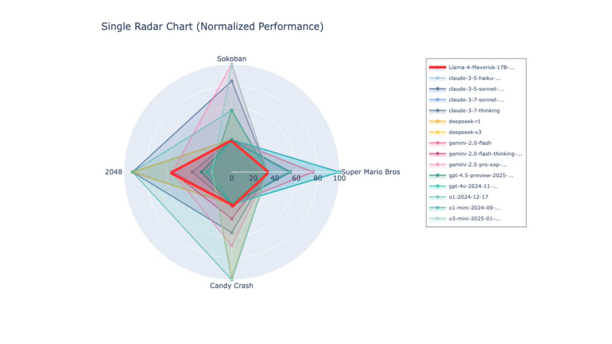 LLaMA-4 Maverick performs well on reasoning benchmarks and ranks 2nd on the Chatbot Arena, yet its true performance remains controversial. What if we put them in a transparent gaming environment? 🎮 Our benchmark tells a different story...🤔