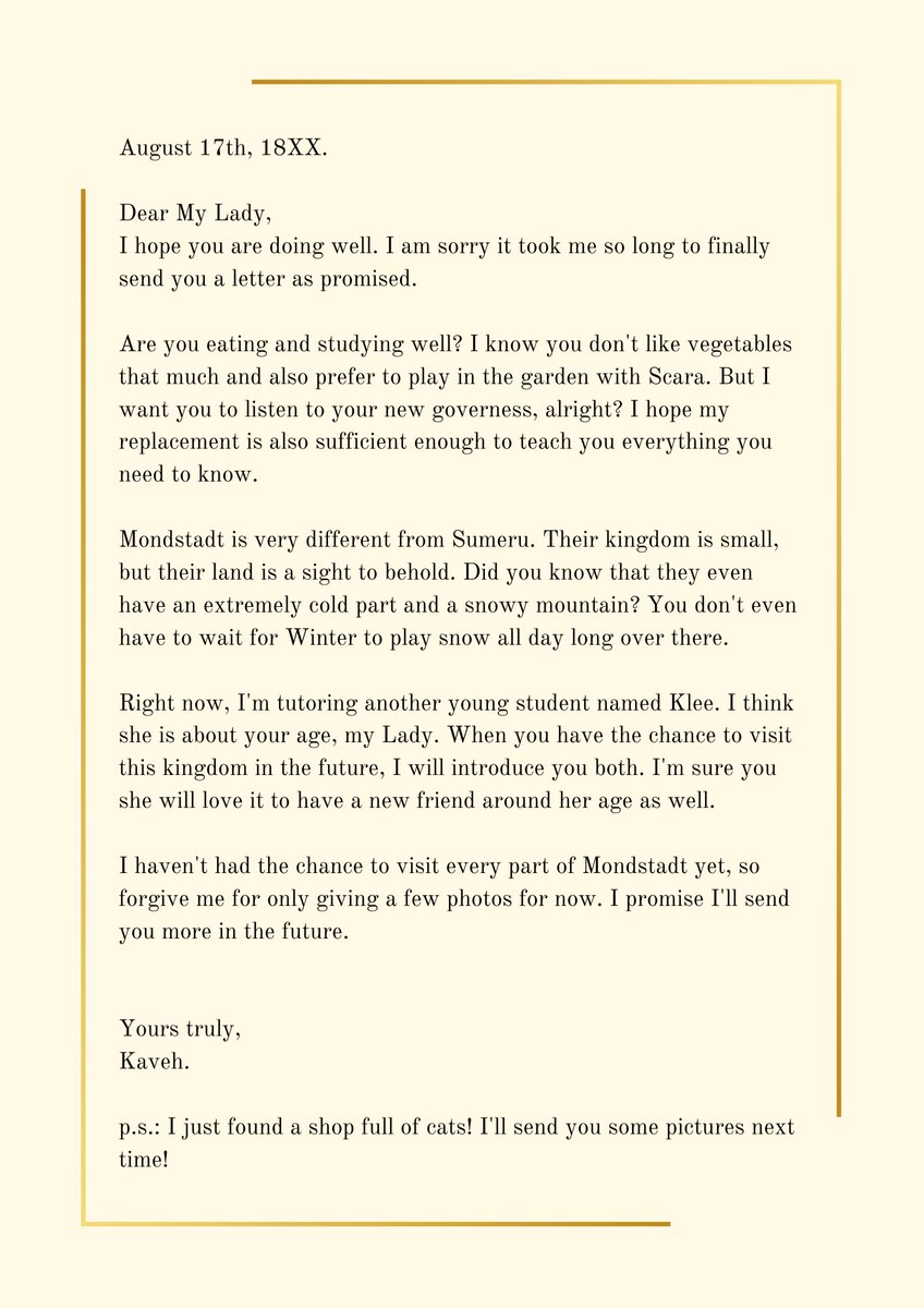 https://twitter.com/hayabusainagawa/status/1649349475545284608[ Pictures of a letter from Earl of Kshahrewar to Duke of Haravatat's daughter, dated August 17th, 18XX. Along with the letter, a few old photographs of Mondstadt were also present inside the envelope. ]