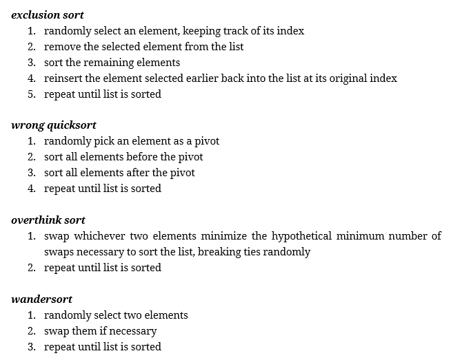 but for those who aren't familiar with the concept, there's a few semi-famous sorting algorithms that exist as jokes that are intentionally slow, but I don't like them because just from reading their descriptions the way they waste time is really obvious