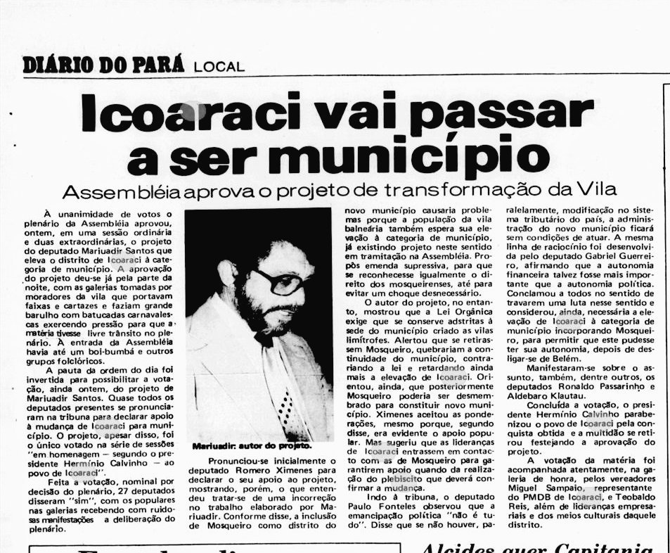 A primeira tentativa de emancipação de Icoaraci foi sistematizada pelo PL 11/1985. A formulação do projeto partiu do então presidente da Assembleia Legislativa Mariuadir Santos, acatando uma iniciativa de pessoas ligadas a diversas entidades da sociedade local +
