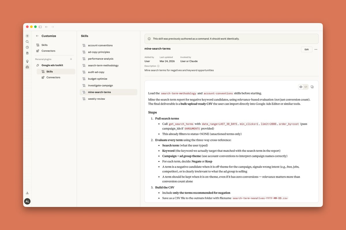 1) my plugin ships with a few skills, including mining for search terms, budget optimizations, weekly reviews, etc. each one is a structured prompt with specific steps, evaluation criteria, and output formats based on my personal working style.