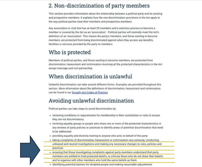 There is a section on how to avoid discriminating against members. Given so many Party members have faced harassment including vexatious complaints this section is helpful. Discusses the need for 'unbiased and neutral investigations' - impossible if zealots run complaint depts