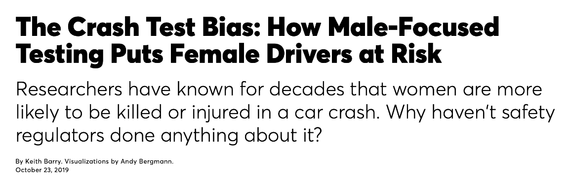 It brought home all the myriad ways sex mattered and how due to the âdefault maleâ in designs and processes as diverse as crash test dummies and snow clearance, that ignoring women and how they differed from men meant worse outcomes for women. 2/n
