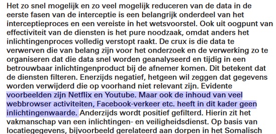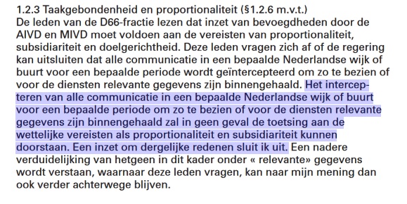 Op vragen van D66 sloot hij expliciet uit dat de communicatie van een wijk of buurt zou worden afgetapt. Evenals het opslaan van Netflix- of Youtube-verkeer 2/12