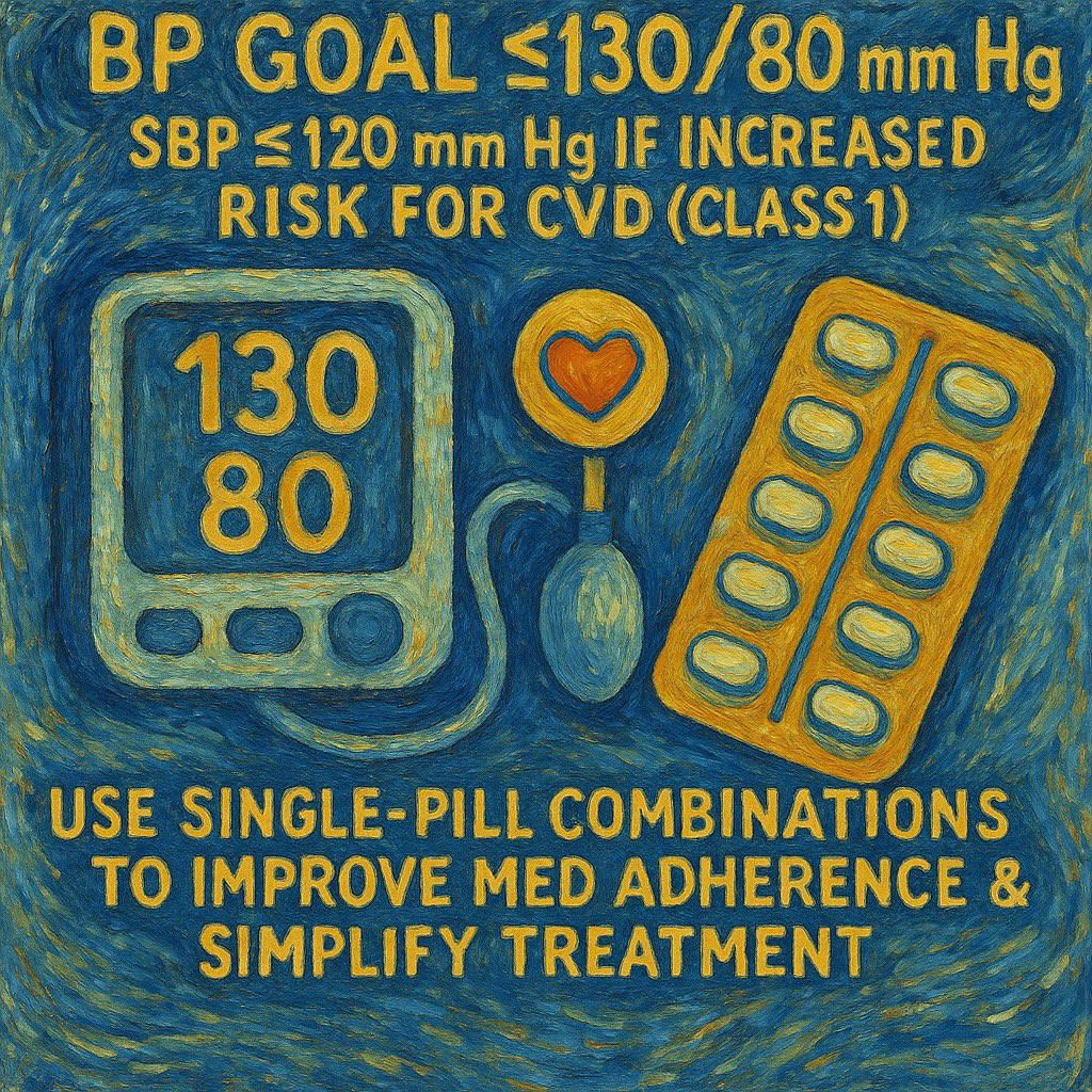 1)BP goal ≤130 /80, SBP ≤ 120 if risk for CVD (class 1)