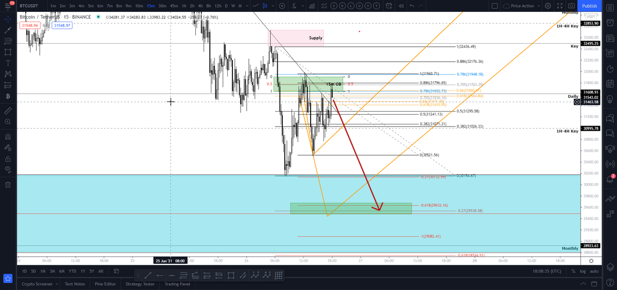 $BTC we retested the 15m OB mitigation for the second time, with the typical bearish harmonic W pattern. Normally from here we target -0.27 or -0.618 FIBs to the downside.