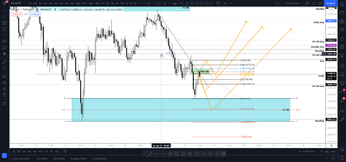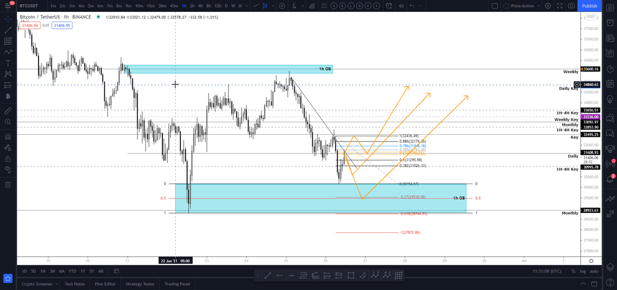 $BTC scenarions I'm watching. I jumped into a low leverage short position, main TP would be $29540 which lines up with my -0.27FIB+ OB. We might break out from here and go up. Another possibility is a smaller retrace and bullish move. Below $28900 we are heading south. That's it.