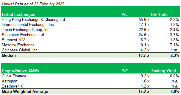P/E multiple measures a protocol’s Mcap based on its earnings power. The low estimate uses the P/E of the Crypto-Native AMMs of 17.2x and high of 23.3x (+25% premium to Listed Exchanges). This gives $SOLID an initial Mcap range of $69M to $93M