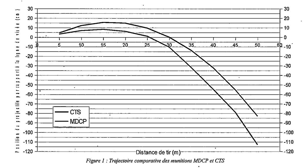 En 2016, des tests sont réalisés avant la généralisation du LBD 40. La police compare la trajectoire des deux munitions disponibles : la CTS et la MDCP (devenue MDU). Le résultat est très clair : il existe une déviation verticale et les trajectoires sont trop différentes